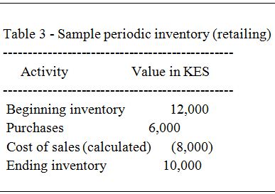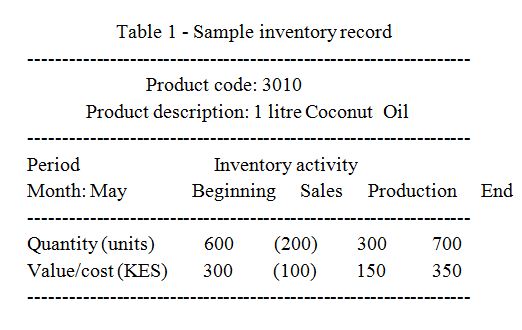 The value is the cost of the product. This would be what a retailer paid for the product or what a manufacturer paid for materials plus labor and other charges applied in converting the materials into the finished product. In Table 10, the cost of goods sold would be KES100 for this product for the month of May. There are two different methods used in inventory record keeping: perpetual and periodic.