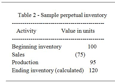 The perpetual inventory method starts with a physical inventory (actual count) and then adjusts this inventory for additions and withdrawals. The inventory at the end of the period is calculated by subtracting the number of units sold from the total of the beginning inventory plus the additional units produced. An example is furnished in Table 2.